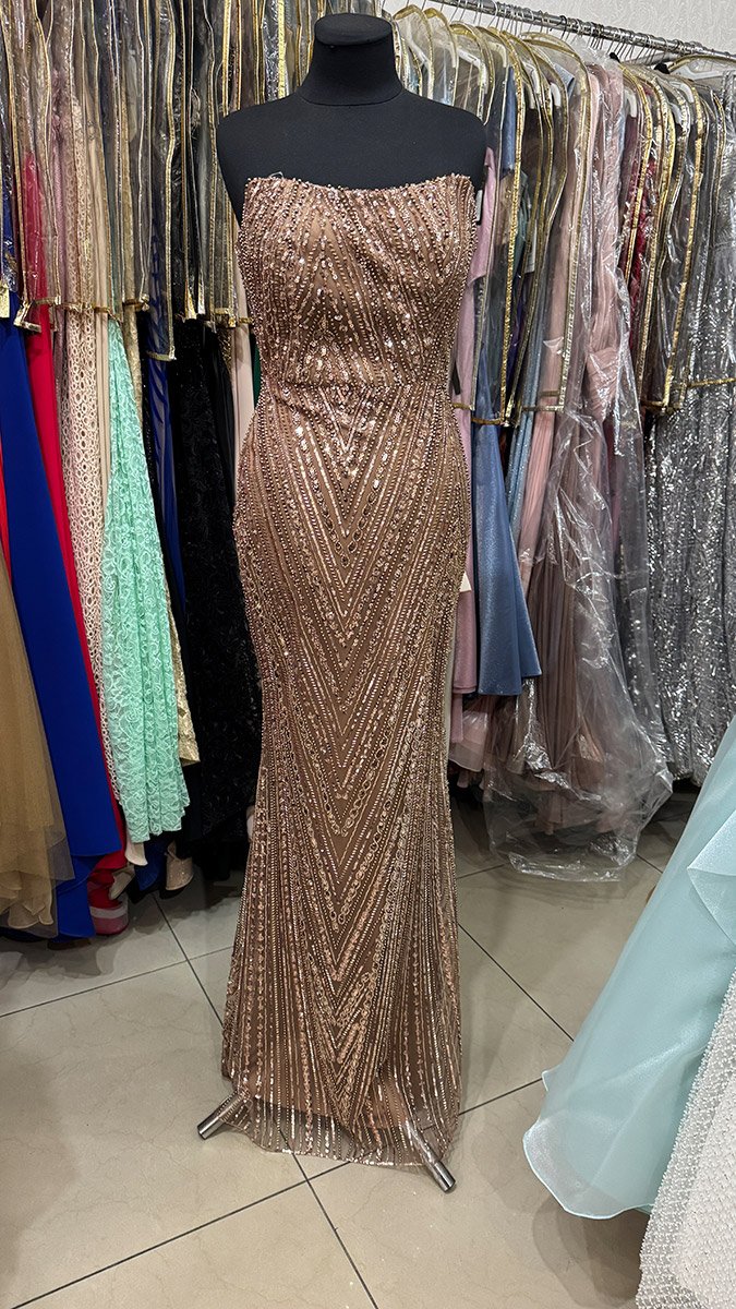 Золота сукня з відкритими плечима по фігурі повністю розшита бісером. Сукня має вшиті чашки, добре тримає груди. По спині звичайна застібка. Сукня золотого кольору із коричневим відтінком.