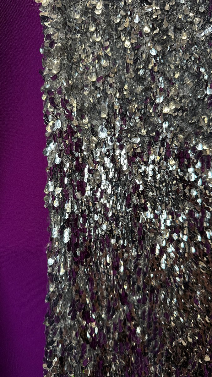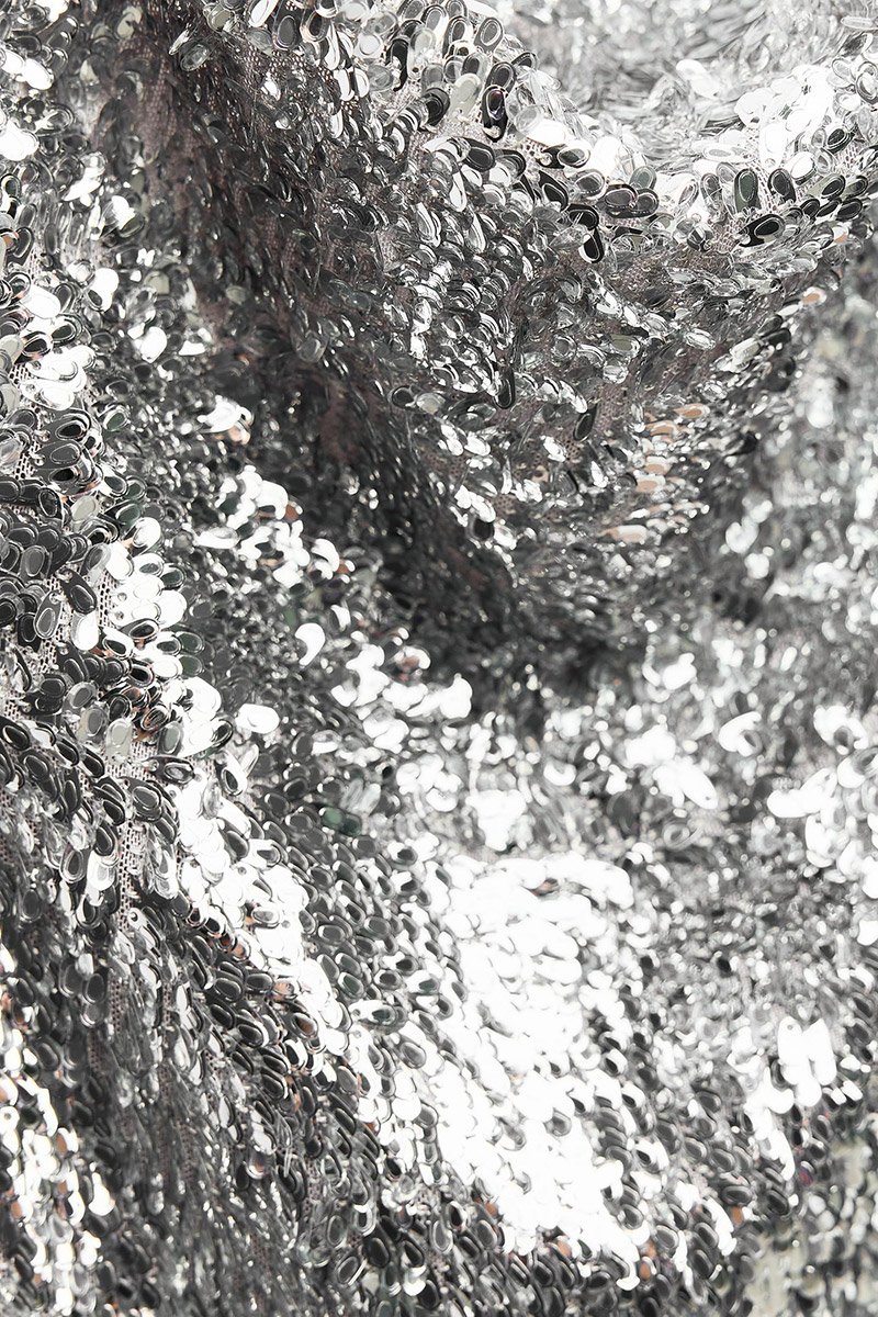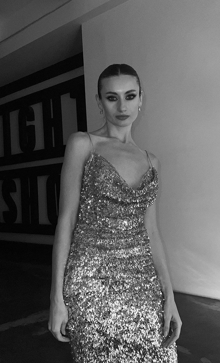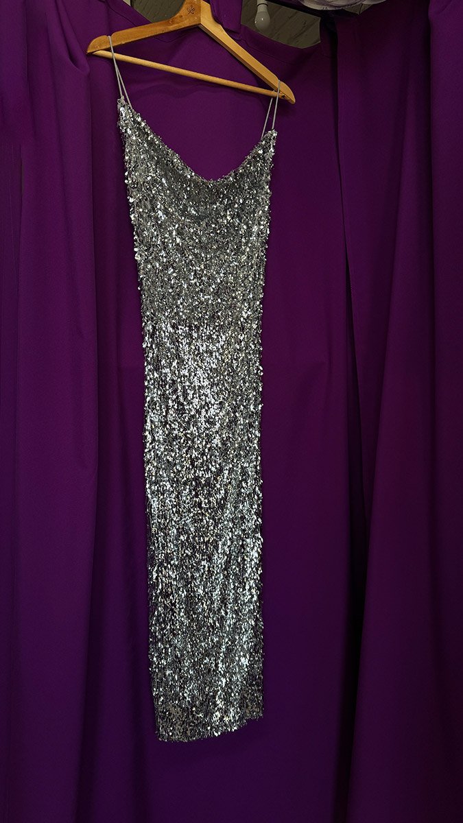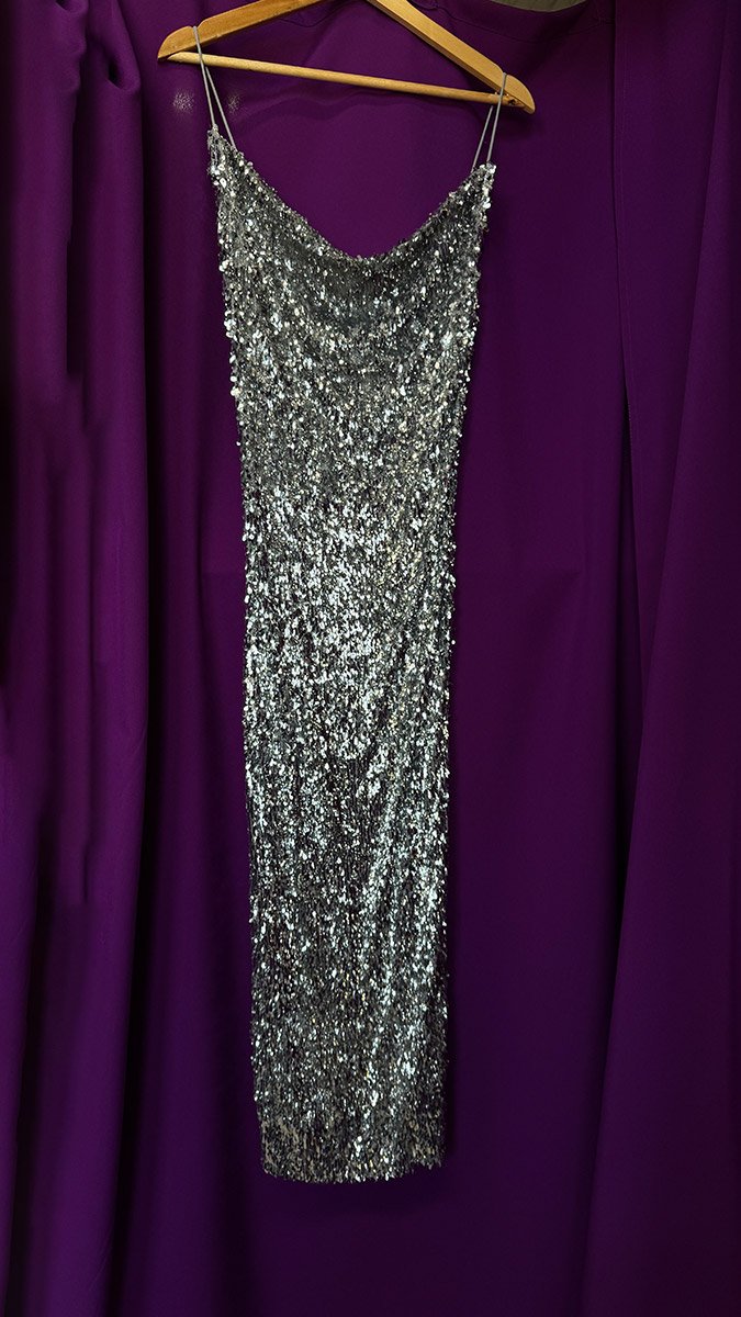 Срібна сукня по щиколотку — розкішна модель, повністю розшита паєтками, які ефектно блищать у світлі. Має тонкі бретелі, м’який виріз на грудях і відкриту спинку. Сукня щільно облягає фігуру, підкреслюючи силует, але не сковує рухів. Завдяки довжині міді й ідеальній посадці підходить для вечірок, фотосесій і урочистих заходів. Підходить під стиль вечірок Великого Гетсбі та відповідає дрес коду коктейльної сукні.