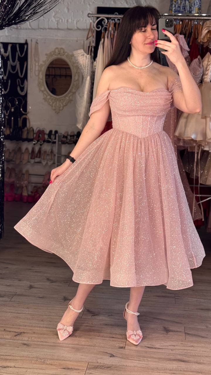 Рожева сукня міді на корсеті. Трендова французька довжина сукні дуже зручна як на заходах, так і для фотосесій.