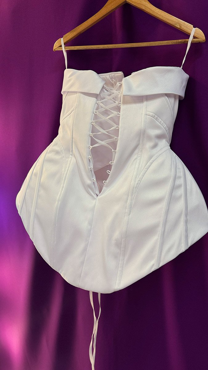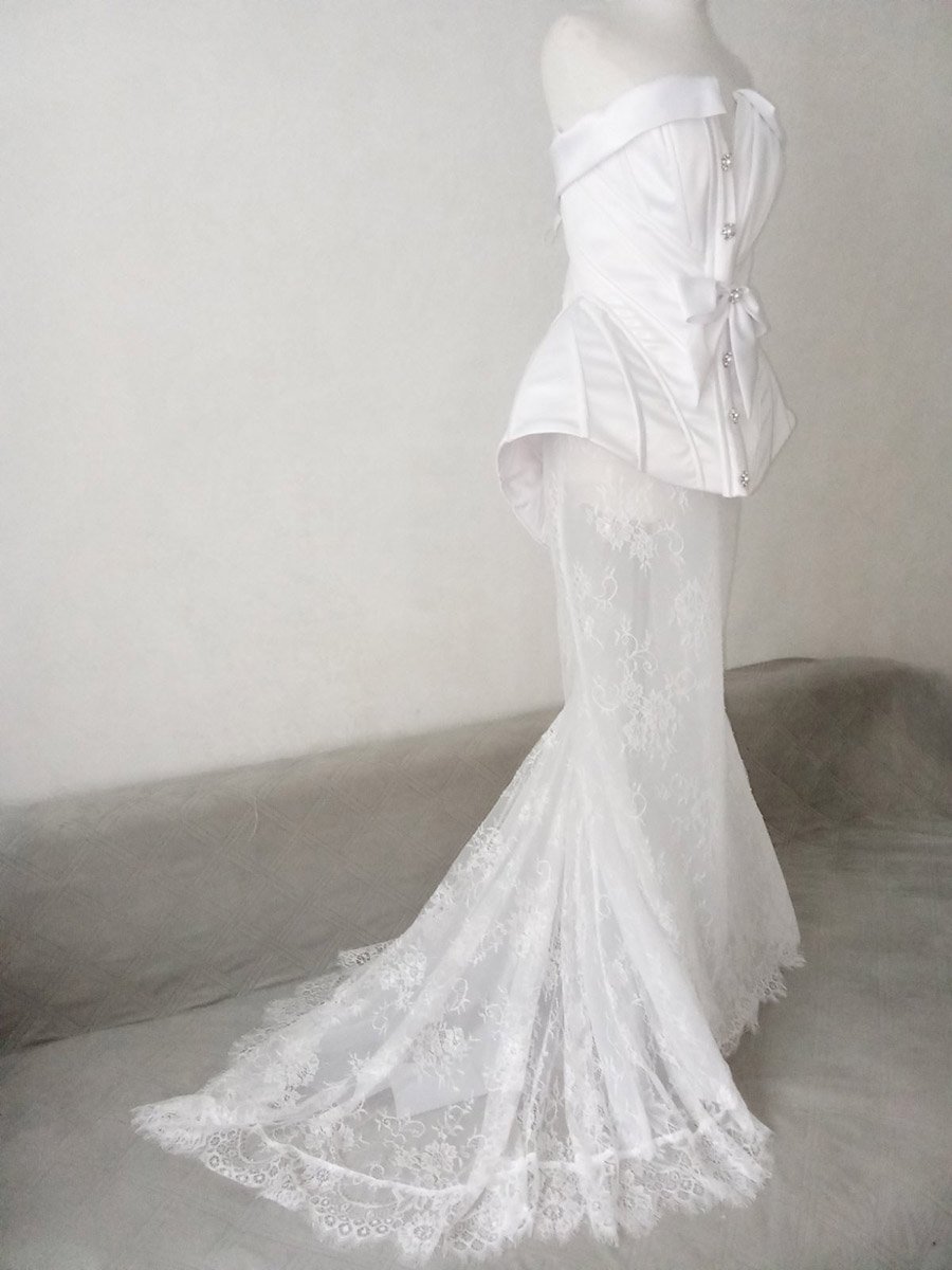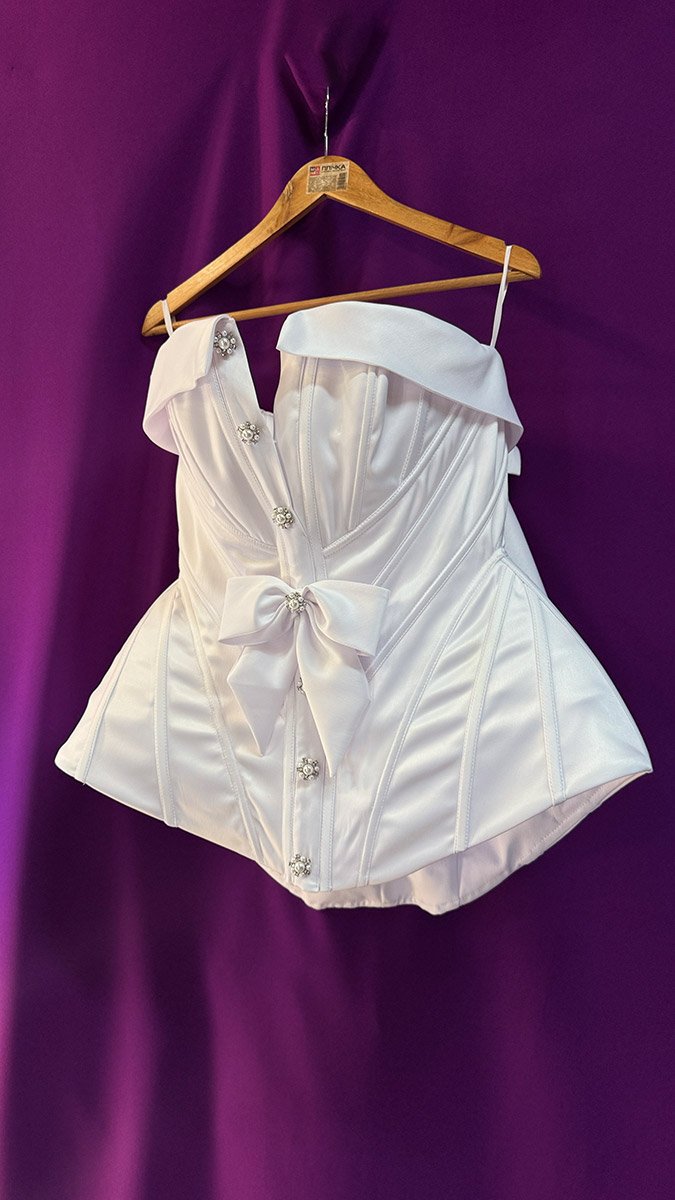 Дизайнерський білий корсет з декольте напрокат. Корсет пошитий із королівського білого атласу (холодний відтінок), який приємний на дотик та має вишуканий блиск тканини. Це є корсет і одночасно міні сукня, так як перед подовжений та має закритий хвіст, що повністю закриває сідниці. По спинці корсет, можна затягувати на 3 розміри. У комплект входять бантики на рукавички. (Рукавички не входять у вартість)