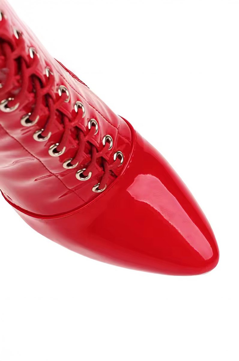 Висока шнурівка, пряжки та вузький каблук-шпилька створюють спокусливий силует, а насичений глянцевий блиск додає розкоші кожному кадру. Червоний лаковий тренч також у наявності.