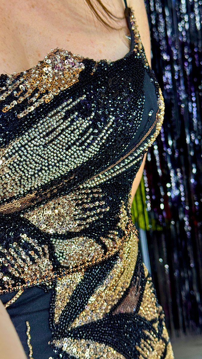 Сукня Мулен Руж має нетипову форму декольте, по спинці є корсет з утяжкою. Сукня повністю розшита бісером, низ оздоблений чорним пірʼям. По ніжці зручний розріз. Брителі на плечах регулються по висоті. Це єдина сукня, ії повторно відшивати не будуть.